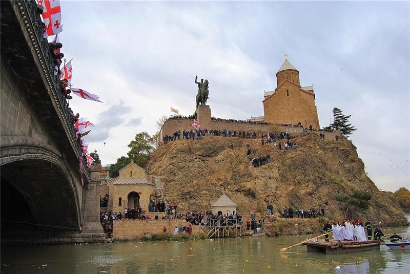 Считается, что на Метехском мосту в 1227 году хорезмийцы казнили сто тысяч грузин, отказавшихся топтать иконы. Страна почти восемь столетий чтит память мучеников, отдавших жизни за веру. В этот день Грузинская православная церковь традиционно проводит службу на мосту.