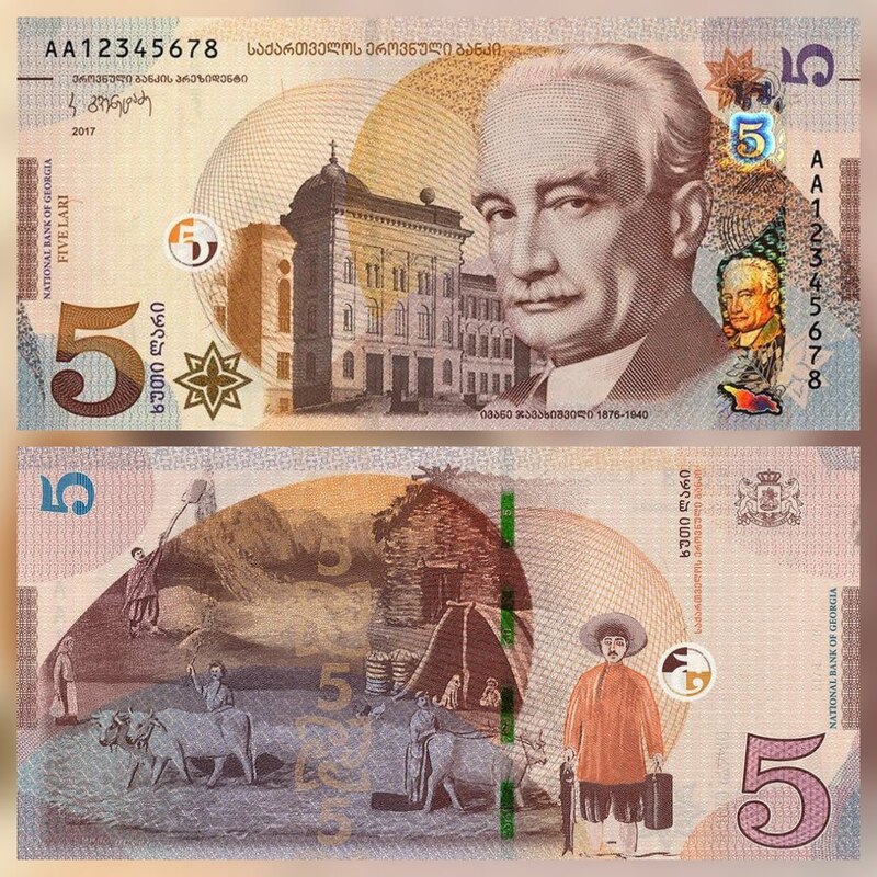 5️⃣ лари. На лицевой стороне – портрет академика Джавахишвили и здание Тбилисского государственного университета, носящего его имя. На обратной стороне – работы великого примитивиста Пиросмани «Рыбак в красной рубашке» и «Кало. Гумно в грузинской деревне».