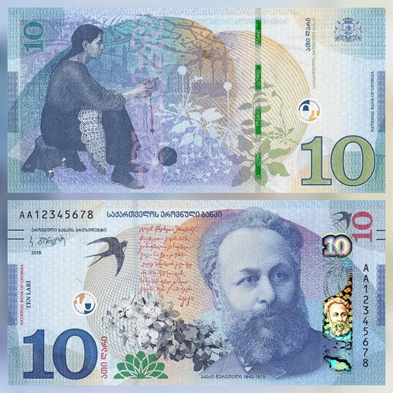 1️⃣0️⃣ лари. На лицевой стороне – портрет поэта и общественного деятеля Церетели и фрагмент его стихотворения «Весна». На обратной стороне – фрагмент картины «Имерети – мать моя» художника Какабадзе.