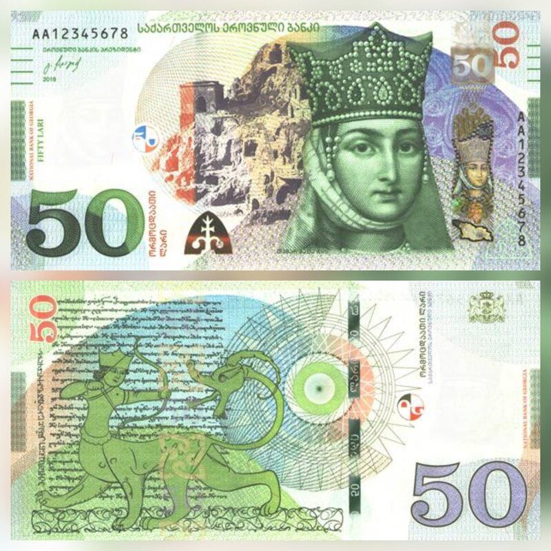 5️⃣0️⃣ лари. На лицевой стороне – портрет царицы Тамар из монастыря Бетания и пещерный монастырь Вардзия. На обратной стороне – изображение стрельца из манускрипта 13 века.