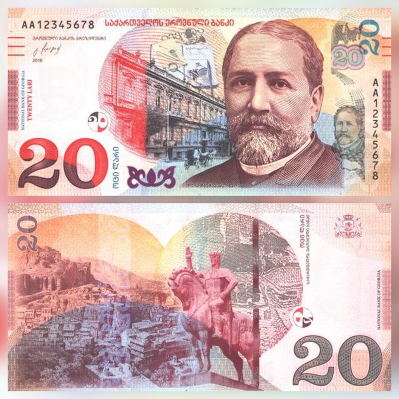 2️⃣0️⃣ лари. На лицевой стороне – портрет общественного деятеля Чавчавадзе и основанные им журнал «Вестник Грузии» и газета «Иверия». На обратной стороне – панорама Тбилиси и памятник царю-основателю города Вахтангу Горгасали.