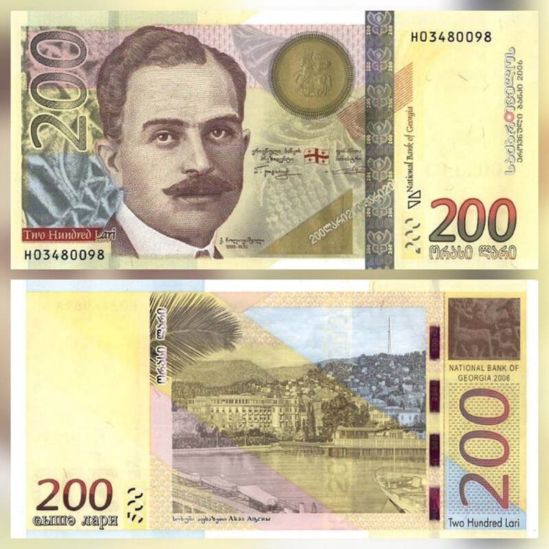 2️⃣0️⃣0️⃣ лари (серия 1995-2006 гг). Мне даже удавалось её подержать в руках в 2019 году. На лицевой стороне – портрет национального героя Грузии Чолокашвили, борца за независимую Грузию. Обратная сторона посвящена Абхазии (вид на Сухуми). Номинал банкнот продублирован на абхазском языке.