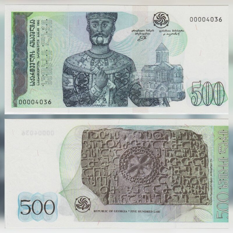 5️⃣0️⃣0️⃣ лари. Были отпечатаны в 1995 году в Великобритании, но так и не вошли в обращение. Теперь это нумизматическая редкость, которая есть только у коллекционеров. В 2011 Нацбанк Грузии выпустил ограниченную сувенирную серию банкнот. На лицевой стороне – портрет царя Давида IV Строителя, у которого в правой руке свиток, а в левой – модель Гелатского монастыря.На обратной стороне – надписи на древнегрузинском и болнисский крест на стенах Сиона, древнейшего храма на территории страны.
