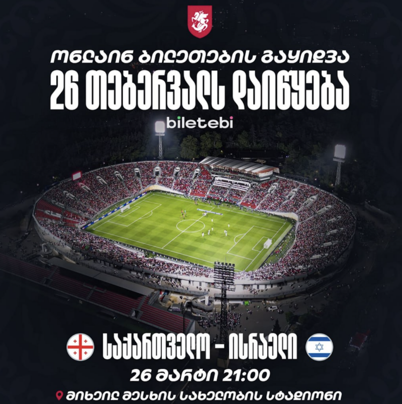 Сама встреча состоится 26 марта на стадионе имени Михаила Месхи — это товарищеский матч. Продажи начнутся в четверг – 12:00, 26 февраля, на платформе Biletebi.ge. Стоимость – 20, 40 и 60 лари, в зависимости от сектора на стадионе. Каждый болельщик может приобрести не более трех билетов.
