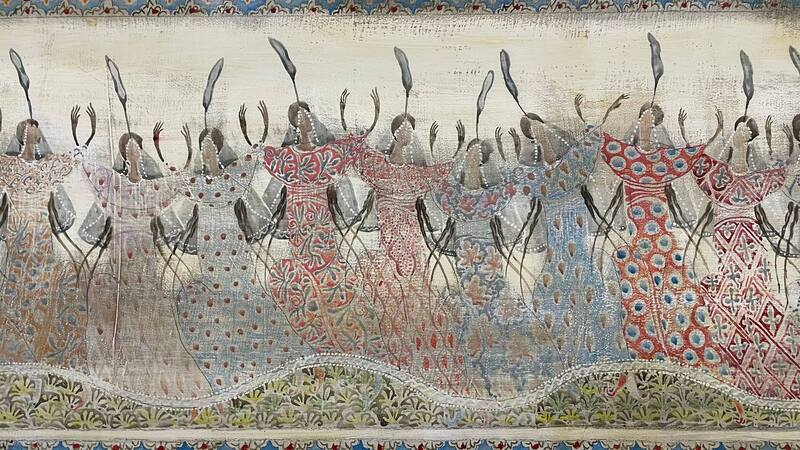 Картины Абрамишвили напоминают старинные фрески и персидские миниатюры. На них распускаются райские сады, поют павлины, танцуют девы, пасутся жирафы и лани. Сравнения с фресками не случайны: художник работал в технике, подражающей средневековым росписям. Писал темперными красками в технике левкаса (сначала на доску наносят несколько тонких слоев грунта из гипса, шлифуют, затем создают произведение и в финале покрывают работу желтком). Все, как у средневековых живописцев. Это сложный и трудоемкий метод, создающий сновидческий, поэтический эффект.