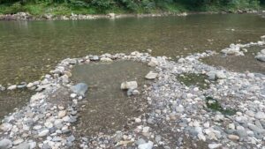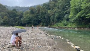 Вода из термального источника (температура достигает 80°C) впадает в реку Техури, образуя природные бассейны. Ну как природные – отдыхающие соорудили с помощью камней запруды, в которых смешивается горячая вода из источника и прохладная из горной речки. Температуру можно регулировать самим, в холодное время лежать в ванночках с видом на окрестные горы, в жару просто купаться в реке. Серные воды считаются целебными при кожных заболеваниях и проблемах суставами.