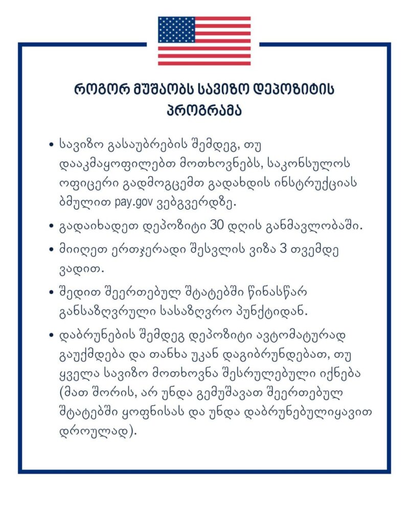 Согласно новым правилам, которые вступают в силу со 2 апреля 2026 года, в рамках программы визового депозита они смогут получить однократную визу сроком до трёх месяцев. Стоимость визового сбора при этом не изменится, пояснили в посольстве США в Грузии.