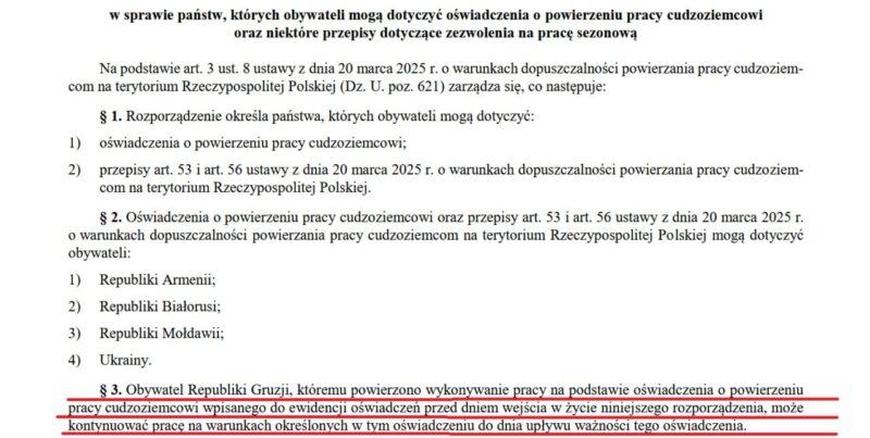 Страна исключена из списка, определяемым приказом министра семьи, труда и социальной политики. Теперь им нужно получать визы в общем порядке. Согласно изменениям, граждане Грузии, работавшие в Польше в рамках упрощенного механизма, смогут продолжать работать до истечения установленного для них срока.