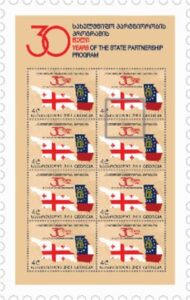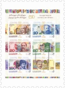30-летие национальной валюты — на листке шесть марок с бумажными купюрами нового образца — 200, 100, 50, 20, 10 и 5 лари. Тираж — 30 тысяч. Цена — 12 лари.