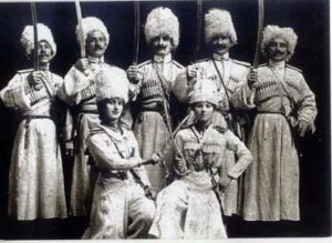 Интересно (и печально), что в Америке их всегда называли «русскими казаками». Некоторые местные журналисты разузнали, что это не так, но и они ошиблись, называя всадников то кавказскими евреями, то кавказскими грузинами, то кавказским племенем из Кутаиси. Тем не менее идентичность «русских казаков» прижилась, а артисты эту роль играли.