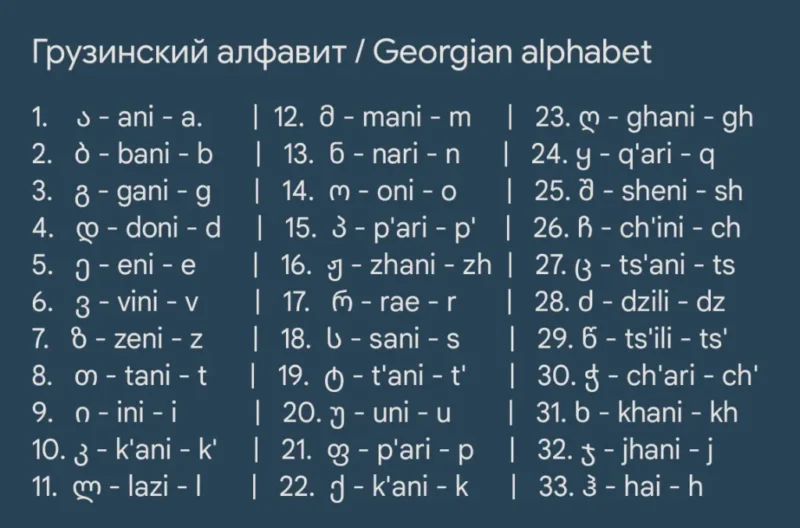 Первые 20 букв алфавита и слова на них начинающиеся: “ა” тут , “ბ” тут, “გ” тут , “დ” тут , “ე” тут , “ვ” тут ,”ზ” тут, “თ” тут , “ი” тут , “კ” тут , “მ” тут , “ნ” тут, “ლ” тут, “რ” тут, “ჟ” тут, “ს” тут , “ფ” тут, “ქ” тут , “ყ” тут , “შ” тут.
