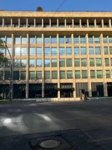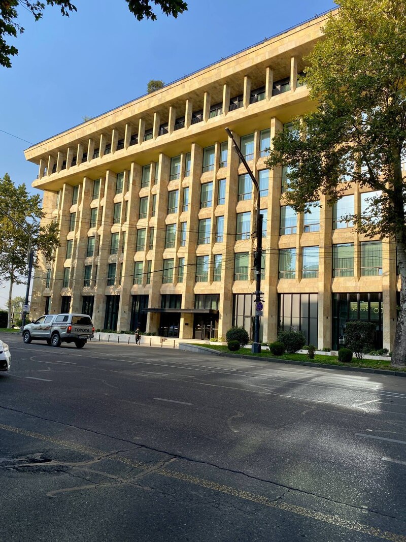 Здание было построено в 1970-х годах по проекту архитекторов Алекси-Месхишвили и Микашавидзе. В советское время оно служило центральным почтово-телеграфным отделением столицы и являлось важным коммуникационным узлом. Это сооружение известно своим архитектурным стилем советского модерна и в 1983 году было удостоено Национальной государственной премии, что подчеркивает его важность в архитектурном наследии Грузии. Здание было задумано как монументальное сооружение, которое одновременно отражало бы прошлое и определяло будущее города. Его отличительный фасад, монументальные карнизы, двойные атриумы и плавная интеграция в окружающую городскую среду сделали его архитектурной достопримечательностью проспекта Руставели.