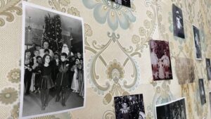 Это маленькая, но эмоциональная экспозиция, способная всколыхнуть воспоминания. На стене, покрытой рулонами советских обоев, копии старых фотографий, начиная с первой рождественской ели в Тбилиси в 1913 году, через конец 1930-х, когда запрет на празднование Нового года в СССР был снят, к снимкам 1970-х и 1990-х годов. Рядом – старые елочные игрушки – космонавты, звезды, дирижабли с аббревиатурой СССР. Именно они послужили отправной точкой для создания новых символов – и самой выставки.