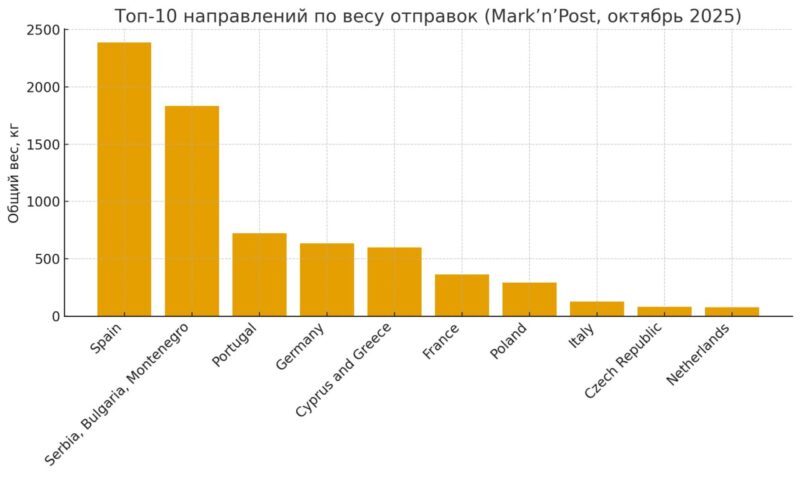 Средний вес одной отправки ≈ 62,6 кг, что говорит скорее о переезде, чем посылках. Средний вес одного грузового места ≈ 17 кг. То есть, в среднем на одну отправку приходилось примерно 3,7 места — несколько коробок, ящиков или чемоданов в одном заказе. Информацию по отправкам предоставила компания Mark’n’Post @marknpost — большое видео с ними делал тут.