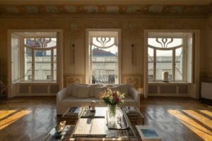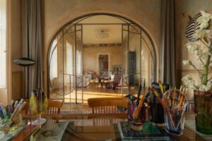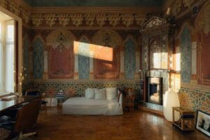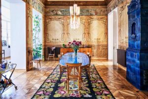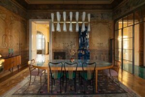 К моменту покупки квартира находилась в плохом состоянии: пространство было разделено на несколько частей, стены скрывали десятки слоёв краски и обоев, многие декоративные элементы считались утраченными. Ремонт начался с консервационных работ. Стены и потолки очищали вручную, слой за слоем, с привлечением реставраторов. Целью было выявить и сохранить максимум оригинальных элементов, а не заменить их новыми. В процессе были обнаружены настенные росписи начала XX века, удивительные фрески с пирующими гномами (!) и оригинальный паркет из нескольких пород дерева. Все найденные элементы бережно сохранили. Сейчас интерьер сочетает архитектуру эпохи модерна с объектами середины XX века, антикварными канделябрами и винтажными грузинскими коврами.