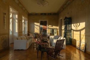 Дизайнер Эка Папамайкл купила квартиру в доходном доме 1902 года постройки в 2016 году. Если вы любите район Чугурети, вы можете помнить это здание с «волнистыми» железными балконами. С фасада образцовое ар-нуво, а со двора – грузинский дом с традиционными деревянными балконами. Изначально квартира принадлежала музыканту Николе Картвелишвили, поселившемуся в ней после возвращения с учебы в Париже. Он нанял архитектора Симона Клдиашвили, одного из ведущих представителей ар-нуво в Тбилиси, чтобы создать дом своей мечты с изогнутыми балконами, потолками высотой в 4,5 метров, венецианскими фресками в гостиной и лаунж-зоной в восточном стиле. В какой-то момент владелец потерял квартиру из-за долгов, а после советизации Грузии дом «уплотнили», заселив разные семьи.