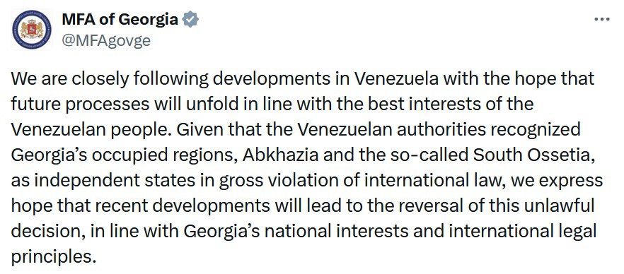 “Мы внимательно следим за развитием событий в Венесуэле, надеясь, что дальнейшие процессы будут развиваться в соответствии с наилучшими интересами венесуэльского народа. Учитывая, что власти Венесуэлы признали оккупированные регионы Грузии — Абхазию и так называемую Южную Осетию — независимыми государствами в грубом нарушении международного права, мы выражаем надежду, что последние события приведут к отмене этого незаконного решения в соответствии с национальными интересами Грузии и принципами международного права”– сказано в заявлении МИД Грузии.