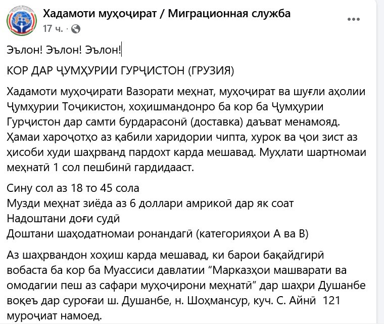 Информация об этом появилась в социальных сетях ведомства. Все расходы, такие как приобретение билета, питание и проживание, оплачиваются самим гражданином Таджикистана. Срок трудового договора – 1 год. От соискателя требуется и предлагается: