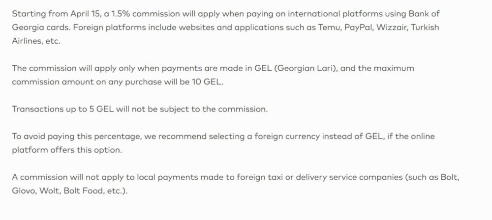 К таким ресурсам относятся, например, сайты и приложения – Temu, PayPal, Wizzair, Turkish Airlines и др. Подробнее с информацией об изменениях можно ознакомиться на сайте банка. Комиссия будет взиматься только при оплате в GEL (грузинских лари), а максимальная сумма за одну покупку составит 10 gel.