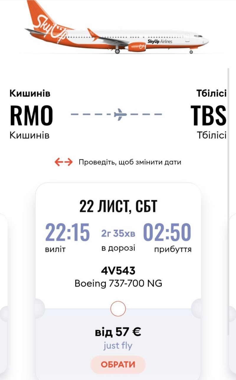 украинская авиакомпания «SkyUp» проводит акцию со значительными скидками. Из Кишинева в Тбилиси ими можно улететь за 57 евро (в одну сторону).