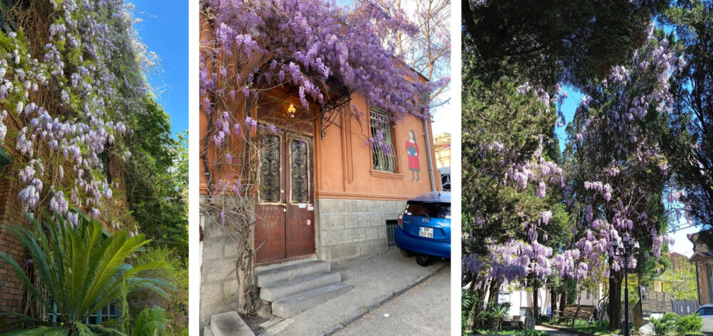 Кстати, помимо глицинии, в Грузии сейчас активно зацветает багрянник японский и жакаранда (фиалковое дерево), камелия, яблоня и миндаль.