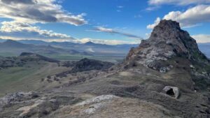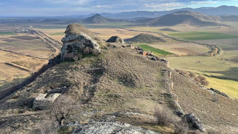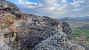Верхний замок расположен на высокой скале, на которую можно подняться, если вы в хорошей форме и рядом есть кто-то, кто может вас подстраховать. Нужно преодолеть пару метров по скале с уступами, а дальше ведет вырубленная в камне лестница. С вершины можно рассмотреть седловину с постройками и саму крепостную стену, почти скрытую под многими метрами земли.